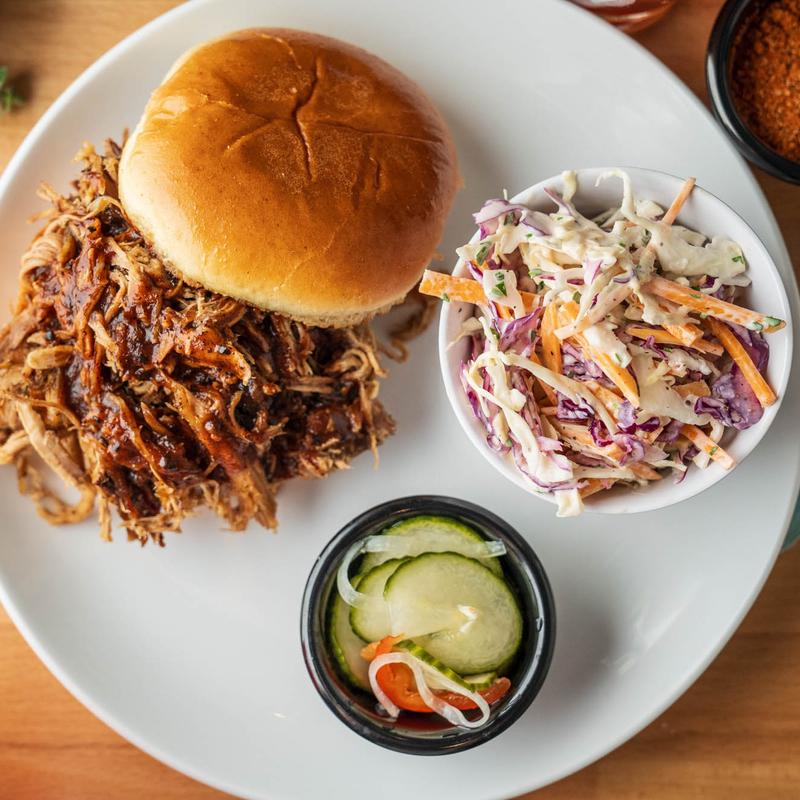 sliced brisket, house BBQ sauce, SOTF slaw, mission bakery sweet potato roll
